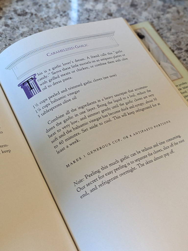 She brings out their cookbook, beaming. I mind the binding, failing from loving overuse, remarking on the signature inside, flipping serendipitously to a recipe for Carmelized Garlic, just the kind of condiment Borelli likes to stock.