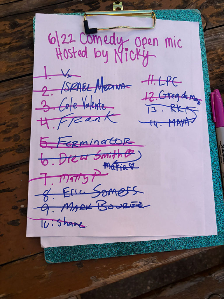 Tonight 14 performers get up to the mic, which is pretty standard, according to Lopez. A majority are middle-aged men who make jokes about sex and politics. Among some of the lines: “Does anyone else have a leaky butthole?” one man asks. Another man speaks about creating a support group for other men with bent penises. A young woman makes her stand-up comedy debut, joking about creepy men on the dating scene while gesturing to men in the crowd.