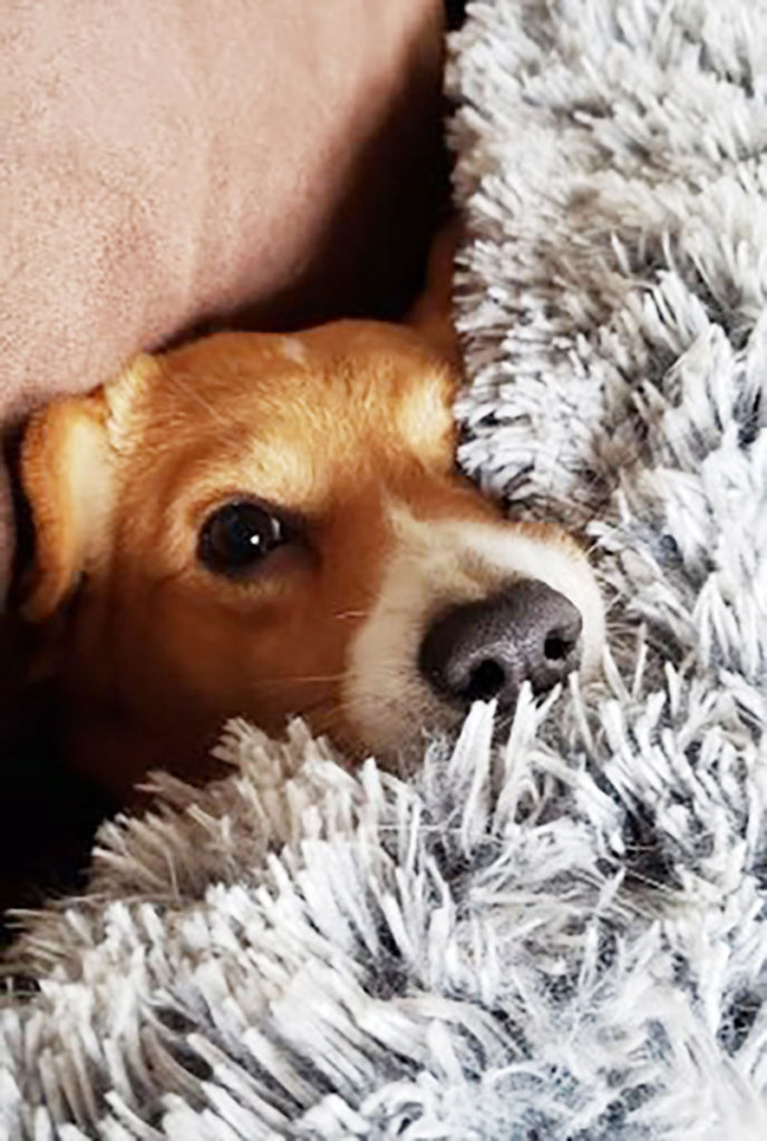 DOG GONE She may look innocent but she’s conjuring up something. My little companion Tazzie. She’s a laugh a minute, I love her so! Hiding in our couch in Aptos.