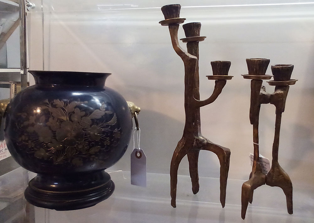 Find all this or more, including a real alligator skull, an ancient barber chair that looks like where Billy the Kid got his last shave, and a pair of awesome, bronze “brutalist” candle holders. Who knew “brutalist” could be applied to candlesticks?